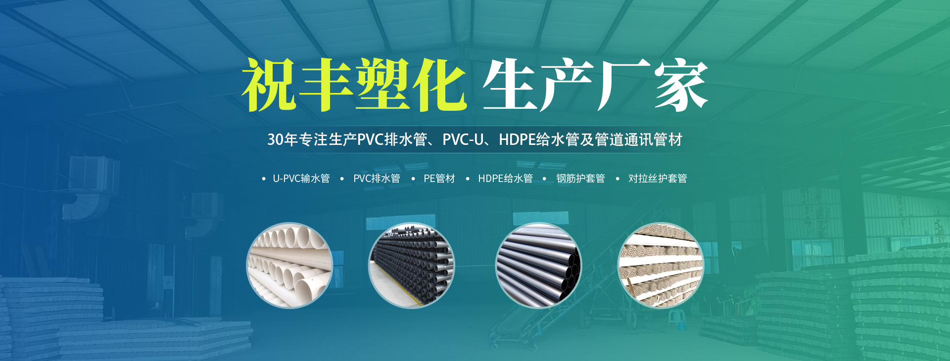 安陽市祝豐塑化有限公司坐落在滑縣工業(yè)園區(qū),東臨大廣高速,西臨京珠高速,是鄭州、鶴壁、安陽、濮陽四個城市的輸紐,交通便利、環(huán)境優(yōu)美。 公司始建于八十年代,經(jīng)過二十余年的艱辛創(chuàng)業(yè),規(guī)模不斷壯大,由十多萬元資產(chǎn)的小廠,發(fā)展到現(xiàn)占地面積達(dá)一萬多平,建筑面積一萬平,資產(chǎn)2000多萬元管材生產(chǎn)企業(yè)。公司生產(chǎn)PVC-U、PVC排水管、HDPE給水管、鋼筋護(hù)套管管道通訊管材等產(chǎn)品,廣泛用于農(nóng)田節(jié)水、高山引水、人畜用水、建筑、電力通訊等多種用途,品種齊全。為了滿足用戶需求,可承攬各種給水、節(jié)水、灌溉工程?!白XS塑化”憑借強(qiáng)勁的實(shí)力,優(yōu)良的管理水平?!耙再|(zhì)量求生存,以信譽(yù)求發(fā)展”的原則全力以赴和大家共同塑造美好未來。..